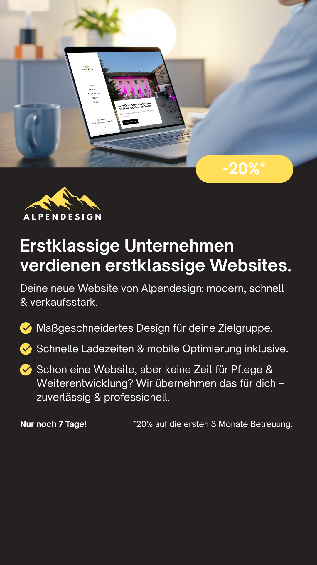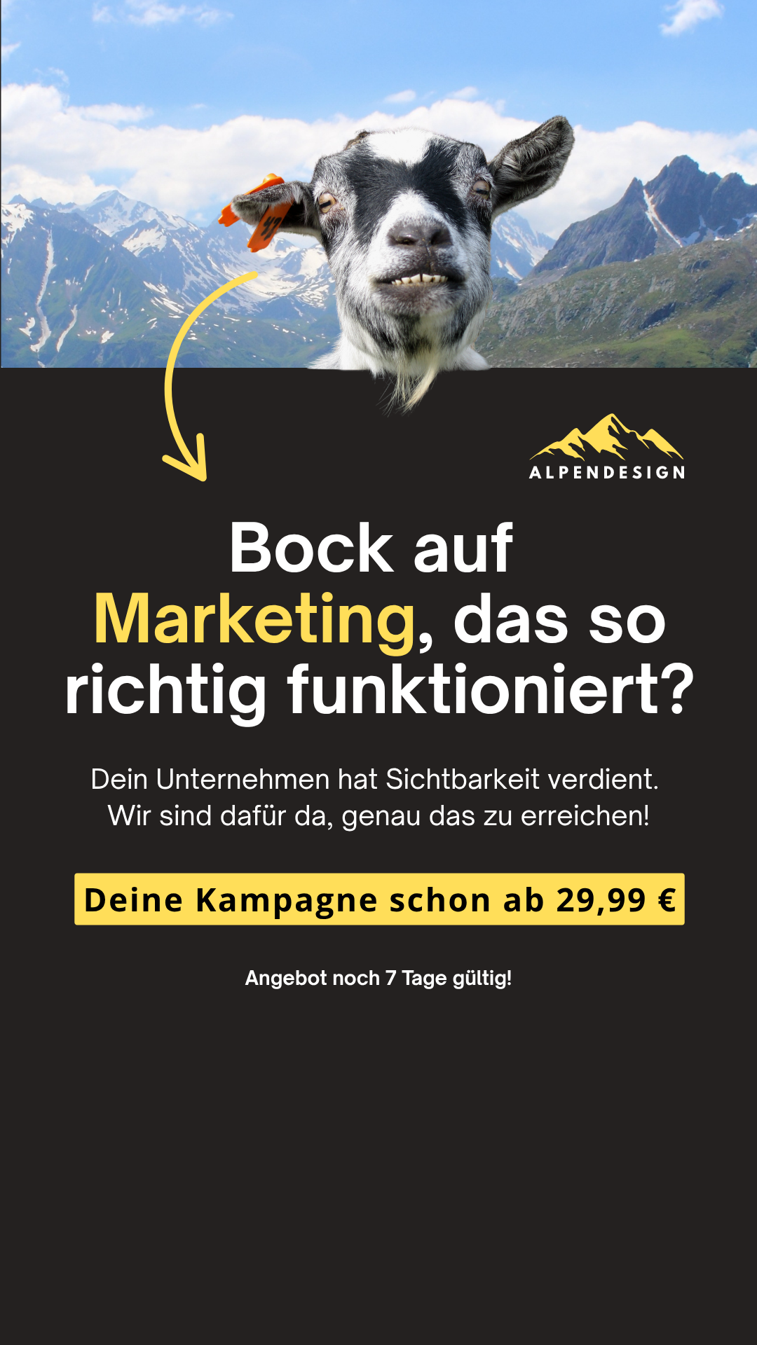 Mit kreativen Kampagnen, durchdachter Strategie und klarer Bildsprache sorgt Alpendesign dafür, dass Marken auf Social Media sichtbar werden – und bleiben. Ob Instagram, Facebook oder LinkedIn: Wir bringen deine Botschaft zur richtigen Zielgruppe und machen aus Reichweite echte Anfragen.